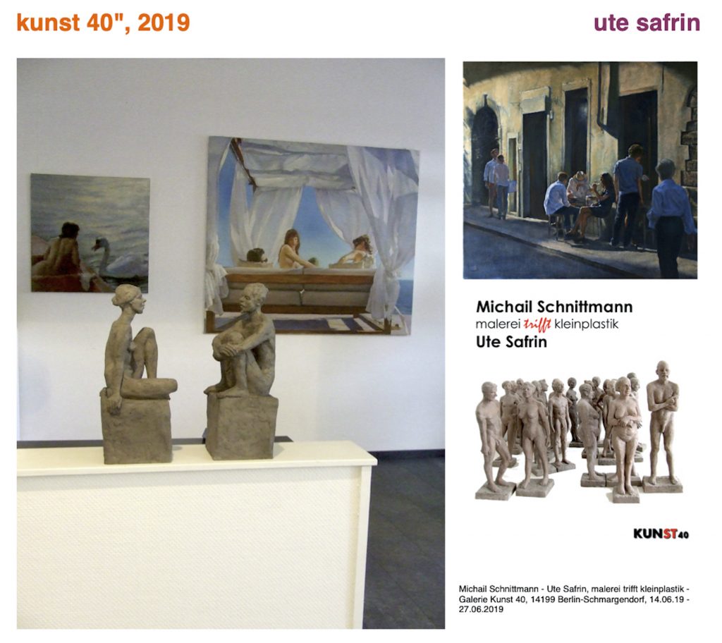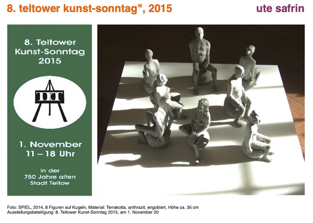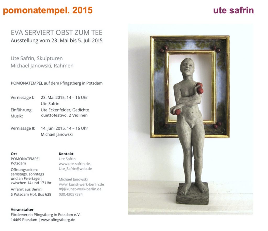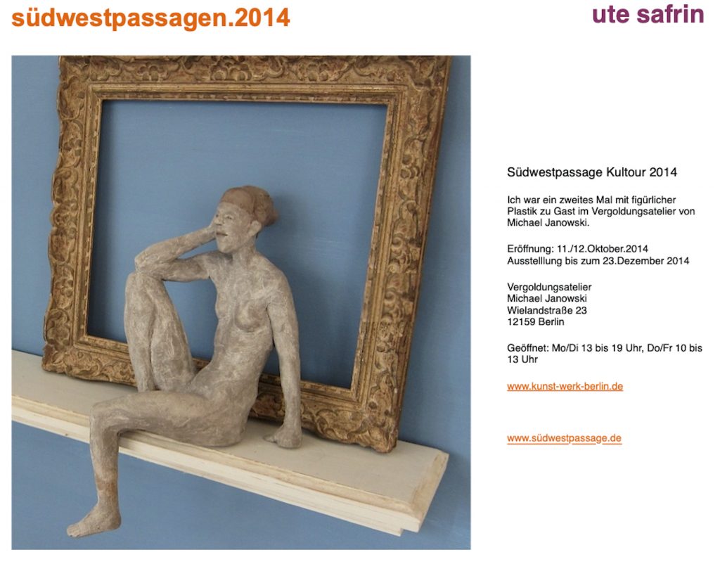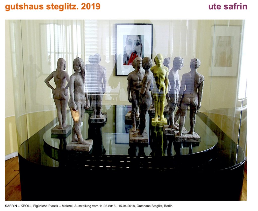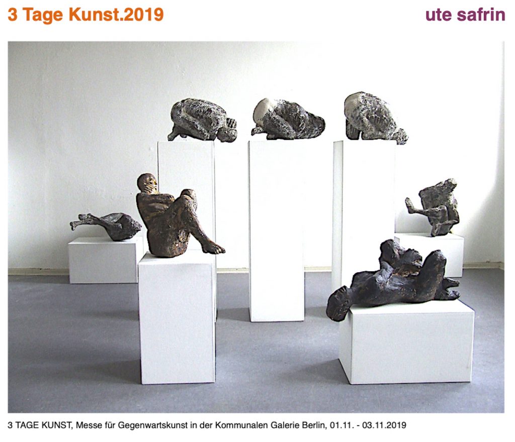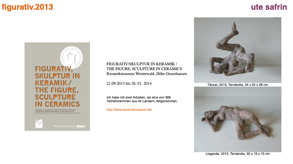 Aussstellung „ZWEI“ Solveig Janetzke – Malerei und Ute Safrin – Skulptur im Kunstverein „Die Brücke“, Kleinmachnow, 19.09. bis 17.10.2021, Foto Iris-NienstedtZWI 2019 Terrakotta, farbig gefasst ca. 50x40x36 cm Aussstellung „ZWEI“ Kunstverein „Die Brücke“, Kleinmachnow„Zwei mal zwei“, 2020, Terrakotta, 60x20x20 cm, 68x20x20 cm Aussstellung „ZWEI“ Kunstverein „Die Brücke“, KleinmachnowZweier (1), 2021, Terrakotta farbig gefasst, 48 x 42 x 30 cm Aussstellung „ZWEI“ Kunstverein „Die Brücke“, KleinmachnowZweier (2), 2021, Terrakotta, farbig gefasst, 46 x 50 x 21 cm Aussstellung „ZWEI“ Kunstverein „Die Brücke“, Kleinmachnow„Doppel P.“, 2021, Terrakotta, farbig gefasst, 60x20x20 cm Aussstellung „ZWEI“ Kunstverein „Die Brücke“, Kleinmachnow„Zitrönchen“, 2021, Terrakotta, farbig gefasst, 48 x 42 x 30 cm Aussstellung „ZWEI“ Kunstverein „Die Brücke“, Kleinmachnow„Zwippe“, 2021, Terrakotta, 45x40x22 cm„Frau mit Schildkr te“, 2021, Terrakotta, farbig gefasst, 45 x 23 x 35 cm Aussstellung „ZWEI“ Kunstverein „Die Brücke“, Kleinmachnow60+ Modell, Ausstellungsbeteiligung in der Galerie bauchhund salonlabor, Berlin-Rixdorf im Rahmen von 48 Stunden Neukölln, 14.06. – 01.07.2016art-figura 2015, Stadt Schwarzenberg, 28.08.2015 – 23.10.2015 (Teilnahme)„60 zum 60.“ 60 Darstellungen des gleichen Modells, Junges Forum Siegburg e.V., 5. bis 16. 08. 2015 (Teilnahme)„Eva serviert Obst zum Tee“, Ausstellung im Pomonatempel in Potsdam auf dem Pfingstberg, Ute Safrin Skulpturen, Michael Janowski Rahmen, 23. Mai bis 5. Juli 2015Schöne Aussichten, 16.01.2015 – 01.03.2015, Villa Sponte zeitkultur e.V., BremenSUEDWESTPASSAGE kultour, 11./12.10.2014, Berlin-Friedenau,Vergoldungsatelier Michael Janowski Wielandstr. 23, 12159 Berlin, Figürliche Plastik, Ausstellungsdauer: 11.10.2014 – 23.12.2014WESEN, Berlin, 02. – 04. Mai 2014, im FORUM FACTORYKERAMIKfrühling, Velten, 12. – 13. April 2014, Gärtnerhof Velten 2013FIGURATIV/SKULPTUR IN KERAMIK / THE FIGURE, SCULPTURE IN CERAMICS, Keramikmuseum Westerwald, Höhr-Grenzhausen, 21.09.2013 bis 26. 01. 2014
