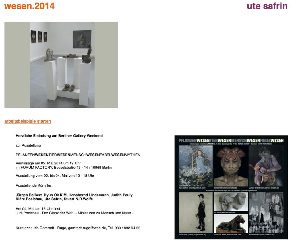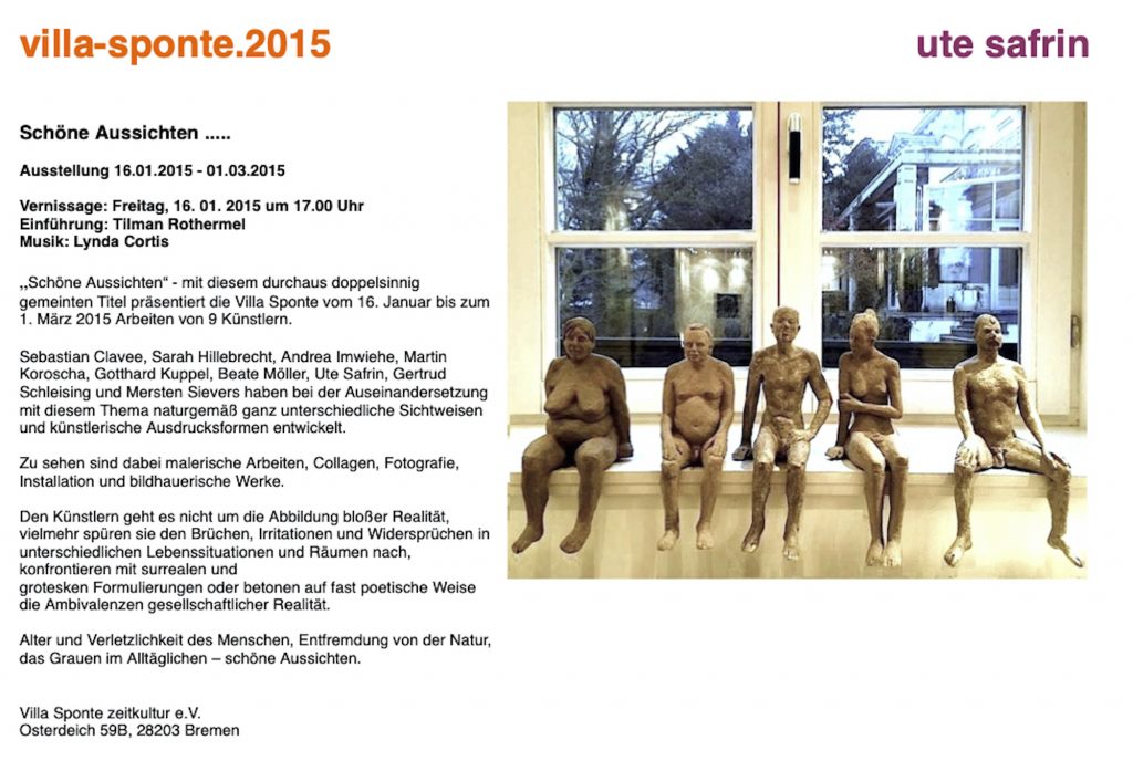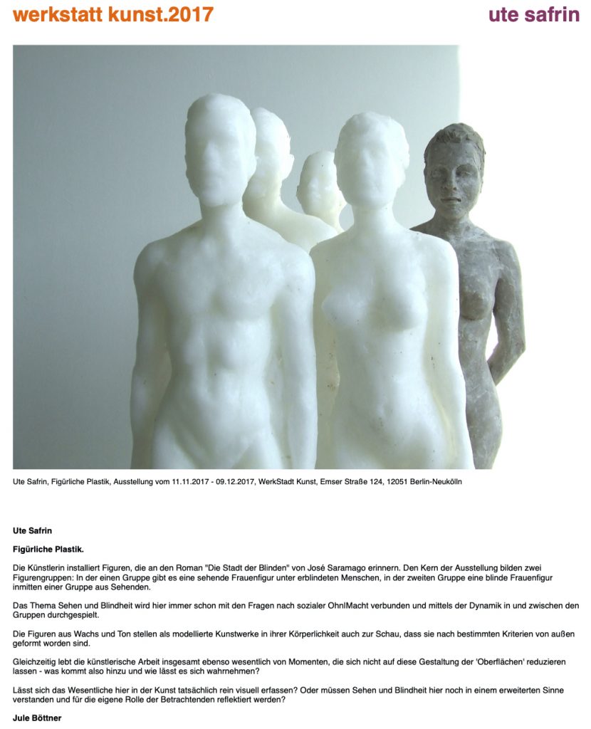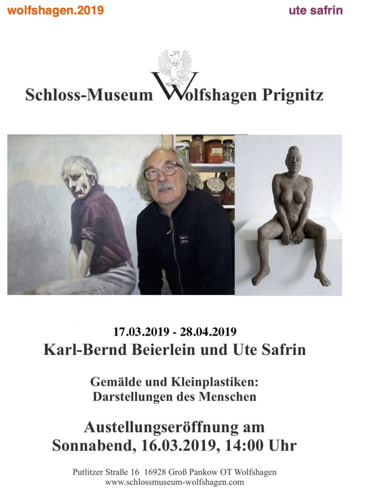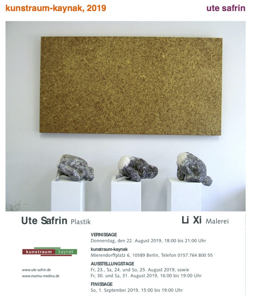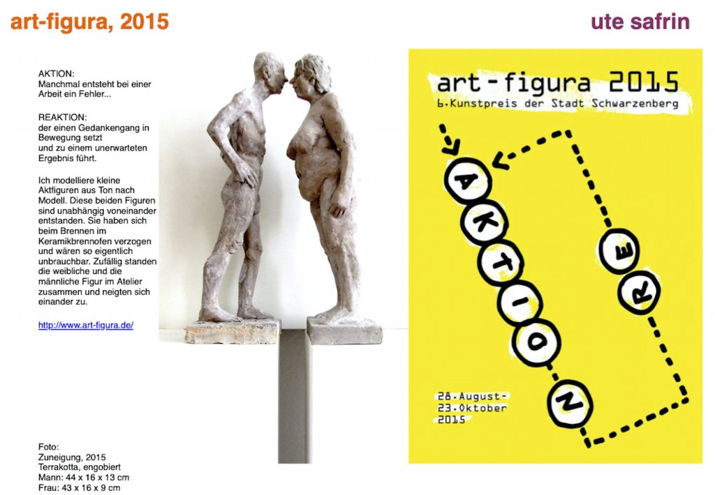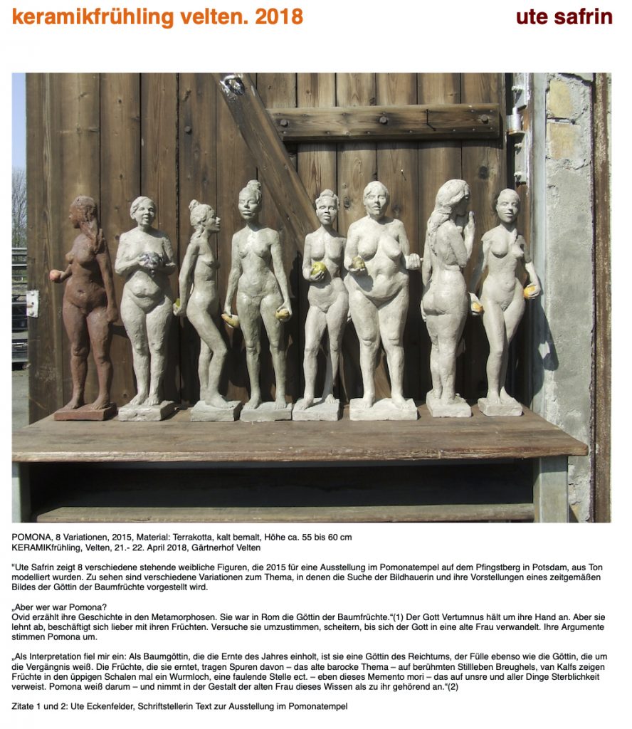 Aussstellung „ZWEI“ Solveig Janetzke – Malerei und Ute Safrin – Skulptur im Kunstverein „Die Brücke“, Kleinmachnow, 19.09. bis 17.10.2021, Foto Iris-NienstedtZWI 2019 Terrakotta, farbig gefasst ca. 50x40x36 cm Aussstellung „ZWEI“ Kunstverein „Die Brücke“, Kleinmachnow„Zwei mal zwei“, 2020, Terrakotta, 60x20x20 cm, 68x20x20 cm Aussstellung „ZWEI“ Kunstverein „Die Brücke“, KleinmachnowZweier (1), 2021, Terrakotta farbig gefasst, 48 x 42 x 30 cm Aussstellung „ZWEI“ Kunstverein „Die Brücke“, KleinmachnowZweier (2), 2021, Terrakotta, farbig gefasst, 46 x 50 x 21 cm Aussstellung „ZWEI“ Kunstverein „Die Brücke“, Kleinmachnow„Doppel P.“, 2021, Terrakotta, farbig gefasst, 60x20x20 cm Aussstellung „ZWEI“ Kunstverein „Die Brücke“, Kleinmachnow„Zitrönchen“, 2021, Terrakotta, farbig gefasst, 48 x 42 x 30 cm Aussstellung „ZWEI“ Kunstverein „Die Brücke“, Kleinmachnow„Zwippe“, 2021, Terrakotta, 45x40x22 cm„Frau mit Schildkr te“, 2021, Terrakotta, farbig gefasst, 45 x 23 x 35 cm Aussstellung „ZWEI“ Kunstverein „Die Brücke“, Kleinmachnow60+ Modell, Ausstellungsbeteiligung in der Galerie bauchhund salonlabor, Berlin-Rixdorf im Rahmen von 48 Stunden Neukölln, 14.06. – 01.07.2016art-figura 2015, Stadt Schwarzenberg, 28.08.2015 – 23.10.2015 (Teilnahme)„60 zum 60.“ 60 Darstellungen des gleichen Modells, Junges Forum Siegburg e.V., 5. bis 16. 08. 2015 (Teilnahme)„Eva serviert Obst zum Tee“, Ausstellung im Pomonatempel in Potsdam auf dem Pfingstberg, Ute Safrin Skulpturen, Michael Janowski Rahmen, 23. Mai bis 5. Juli 2015Schöne Aussichten, 16.01.2015 – 01.03.2015, Villa Sponte zeitkultur e.V., BremenSUEDWESTPASSAGE kultour, 11./12.10.2014, Berlin-Friedenau,Vergoldungsatelier Michael Janowski Wielandstr. 23, 12159 Berlin, Figürliche Plastik, Ausstellungsdauer: 11.10.2014 – 23.12.2014WESEN, Berlin, 02. – 04. Mai 2014, im FORUM FACTORYKERAMIKfrühling, Velten, 12. – 13. April 2014, Gärtnerhof Velten 2013FIGURATIV/SKULPTUR IN KERAMIK / THE FIGURE, SCULPTURE IN CERAMICS, Keramikmuseum Westerwald, Höhr-Grenzhausen, 21.09.2013 bis 26. 01. 2014